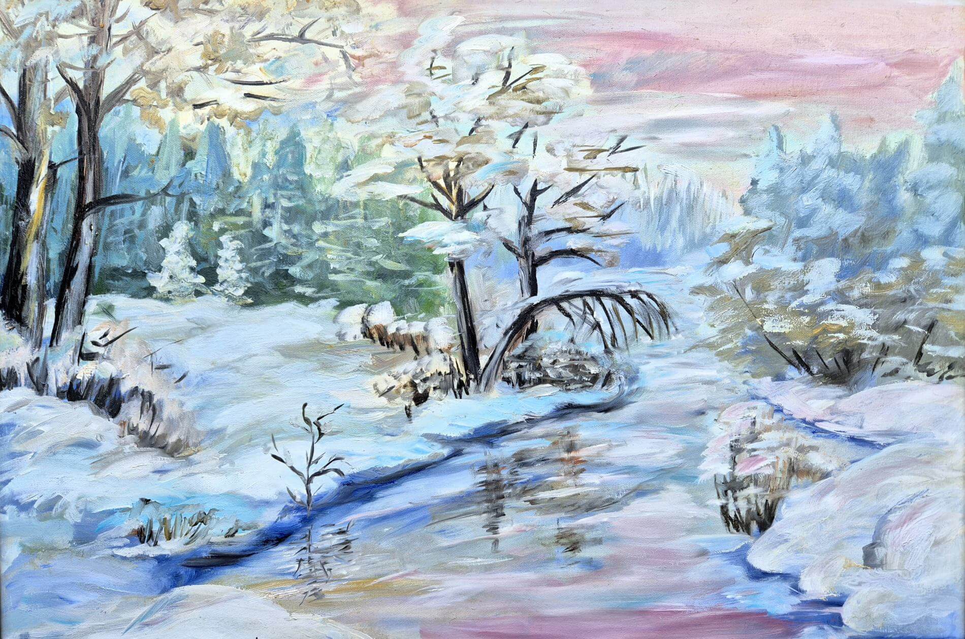 Pastelowy poranek nad zimową rzeką – obraz na dykcie malarskiej