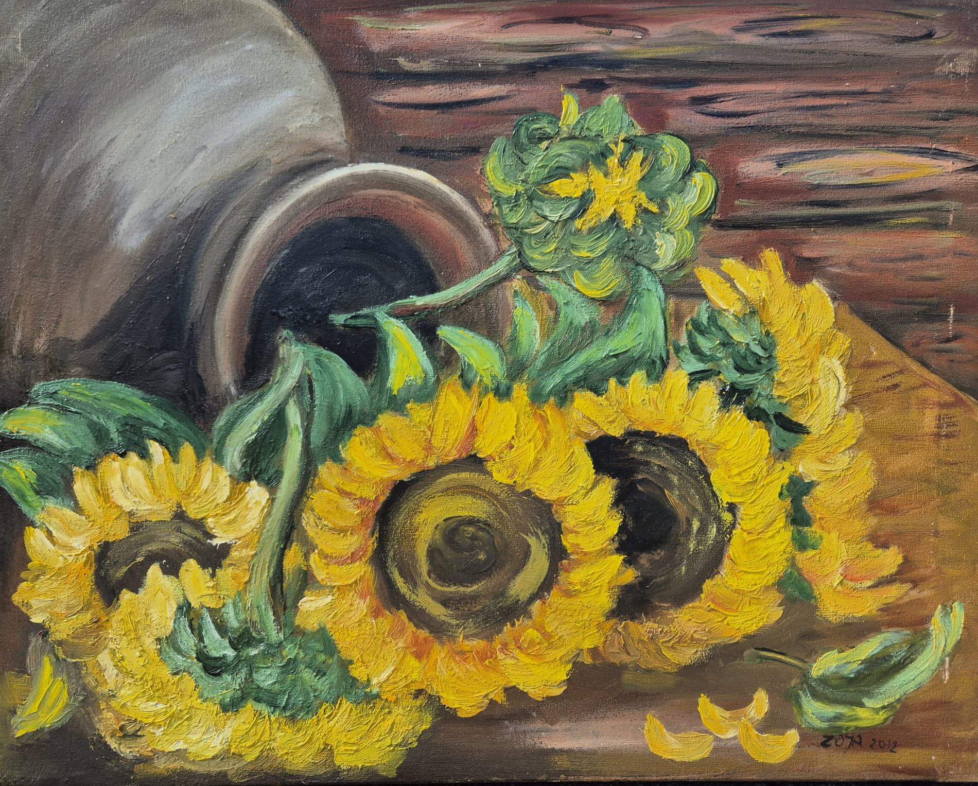 Obraz „Słoneczniki w przewróconym wazonie” na płótnie przedstawia bukiet dojrzałych, żółtych kwiatów, rozsypanych swobodnie na drewnianym blacie obok przewróconego, glinianego dzbana. Intensywne odcienie złota i żółci kontrastują z ciemnymi, głębokimi tonami tła, tworząc nastrojową i jednocześnie energetyczną kompozycję. Fakturalne, wyraźne pociągnięcia pędzla oddają bogactwo kształtów i miękkość płatków, podczas gdy soczysta zieleń liści wprowadza świeżość i harmonię. Malarskie tło w odcieniach brązu i ochry podkreśla ciepło sceny, nadając jej ponadczasowy, klasyczny charakter. Całość emanuje spokojem i melancholią kończącego się lata, czyniąc obraz idealnym akcentem do wnętrz w stylu rustykalnym lub klasycznym, wnoszącym do nich naturalne piękno i odrobinę nostalgii.