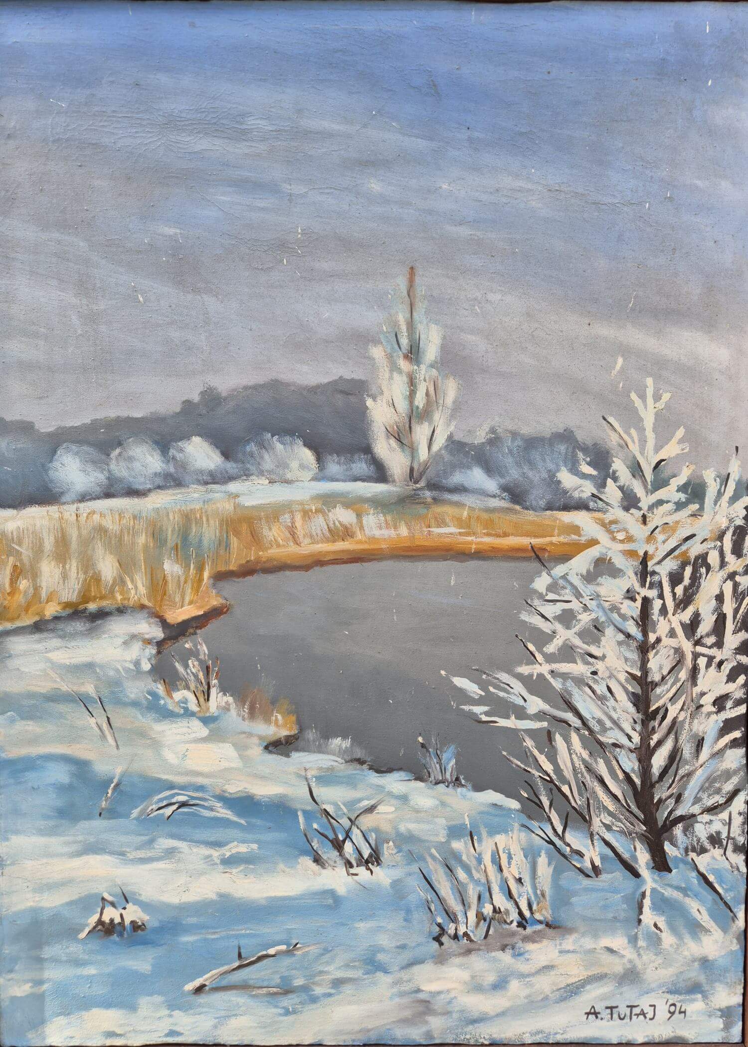 Obraz „Zimowe brzegi stawu” na płótnie przedstawia spokojny, mroźny pejzaż, w którym tafla zamarzniętej wody łagodnie kontrastuje z otaczającym ją śnieżnym krajobrazem. Na pierwszym planie, po prawej stronie, wyrasta smukły krzew oblepiony białym puchem. Jego ciemne gałązki rysują się wyraźnie na tle jasnego śniegu. Po lewej stronie brzeg stawu łagodnie opada ku wodzie, porośnięty kępami suchych, złocistych traw, które dodają kompozycji ciepłego akcentu.