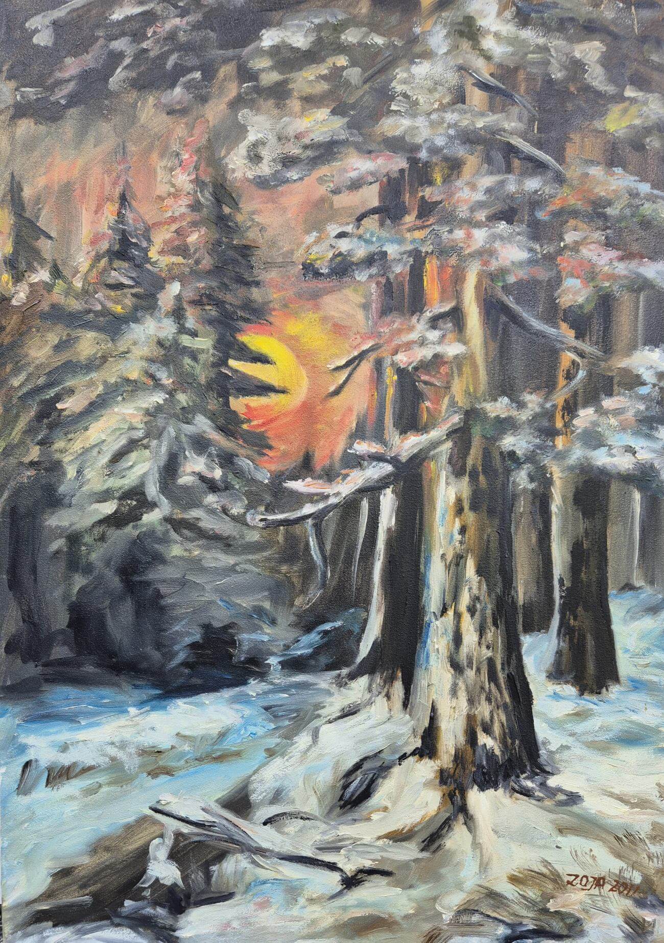 Obraz „Zimowy las w blasku zachodu” na płótnie przedstawia gęsty, iglasty bór otulony warstwą świeżego śniegu, przez który przebija się ciepły blask zachodzącego słońca. Intensywne żółcie i pomarańcze nieba kontrastują z chłodnymi odcieniami błękitu, szarości i bieli, nadając scenie wyrazistego dramatyzmu. Promienie słońca, rozpraszające się między pniami i ośnieżonymi gałęziami, tworzą wrażenie migotania światła w ciszy mroźnego popołudnia. Fakturalne pociągnięcia pędzla podkreślają chropowatość kory drzew oraz miękkość śniegu, a delikatne przejścia barw nadają pejzażowi głębię i realizm. Całość tchnie aurą spokoju i siły natury, uchwyconą w momencie, gdy dzień ustępuje miejsca zimowej nocy.