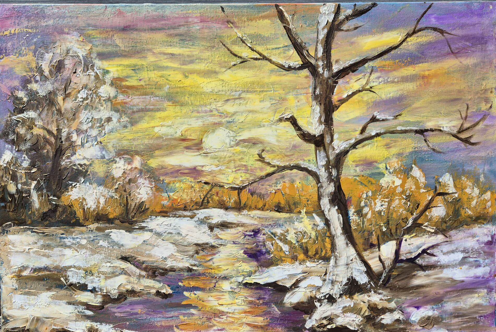 Obraz „Zimowy zmierzch nad rzeką” na płótnie przedstawia szeroką, ośnieżoną dolinę, przez którą leniwie płynie wąska rzeka, odbijając w swej tafli złote i purpurowe smugi zachodzącego słońca. Na pierwszym planie, po prawej stronie, stoi rozłożyste drzewo o nagich, ciemnobrązowych konarach, gdzieniegdzie oblepionych świeżym śniegiem. Po lewej stronie, w oddali, majaczą sylwetki drzew i krzewów. Ich gałęzie połyskują bielą na tle ciepłych odcieni żółci i pomarańczu.